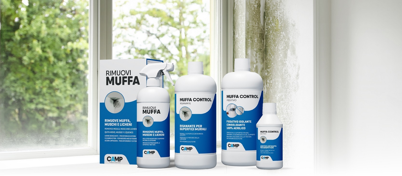Il primo step del trattamento prevede l’applicazione di Camp Rimuovi Muffa, che elimina rapidamente le macchie di muffa più tenaci e igienizza le superfici.