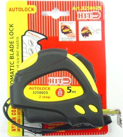 Il nuovo flessometro Autolock 3250025 HIT è dotato di due pulsanti di stop e funzionamento inverso. Il nastro rimane bloccato automaticamente nella posizione in cui è estratto, e il pulsante di stop deve essere premuto soltanto per il suo riavvolgimento. Misura 5x25 metri.