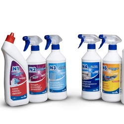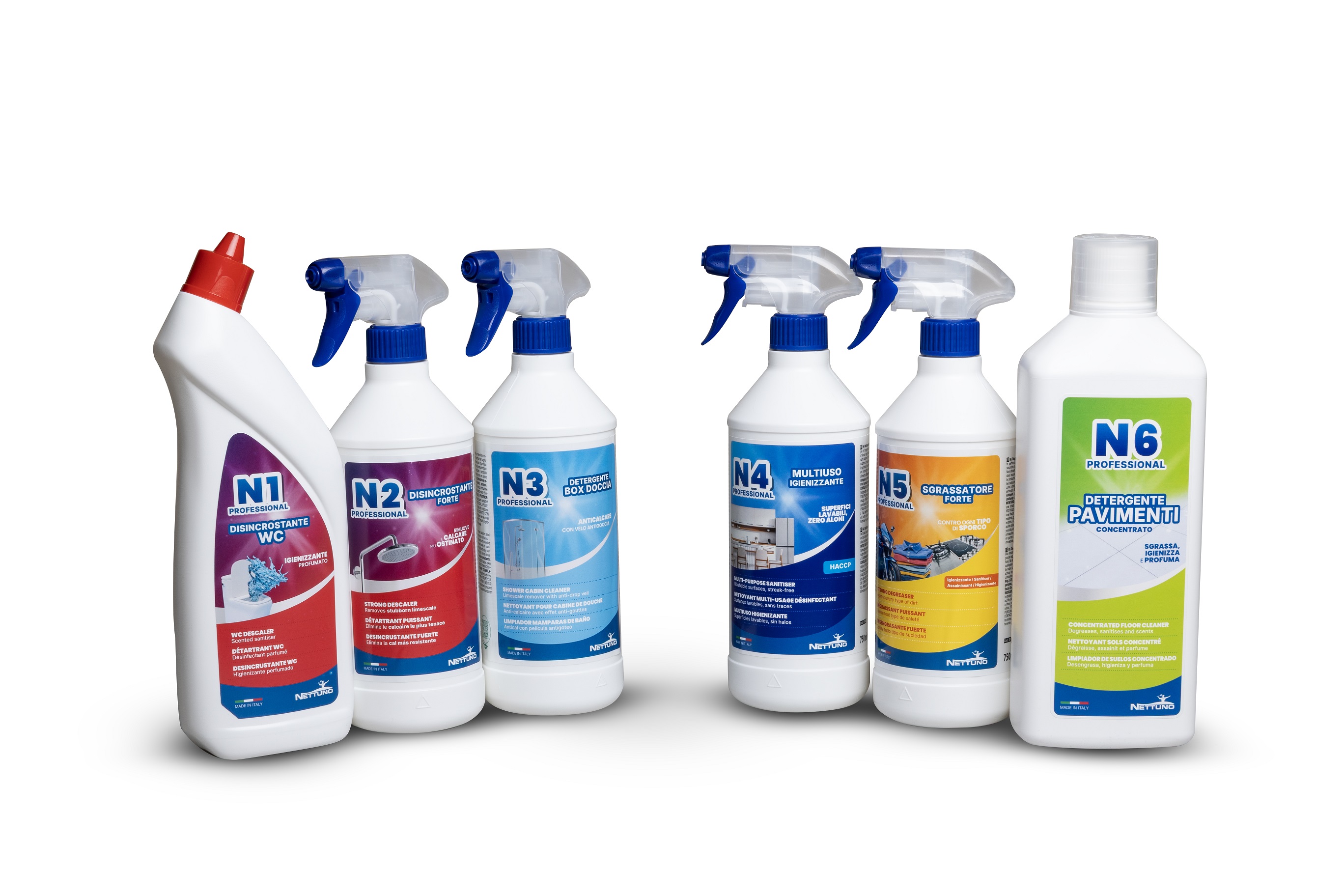 Cura delle superfici: N4 – Multiuso Igienizzante; N5 – Sgrassatore Forte igienizzante; N6 – Detergente Pavimenti concentrato.