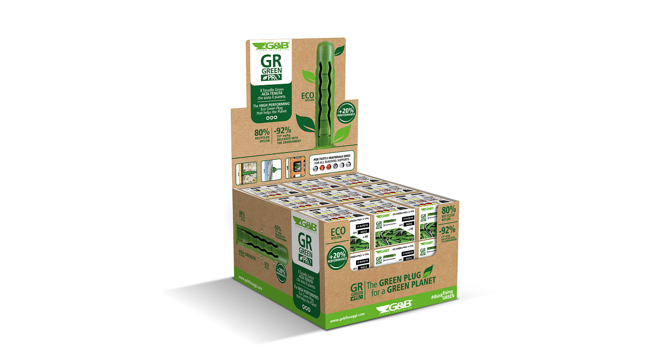 GR Green Pro di G&B Fissaggi è un tassello per fissaggi universali, adatto ai principali supporti edili, con un corpo espandente in 4 settori e collarino elastico per un fissaggio passante. È un tassello innovativo prodotto con oltre l’80% di nylon riciclato di alta qualità, e con - 92% CO2/kg di emissioni di anidride carbonica nell’ambiente rispetto a un prodotto analogo. Anche il packaging è stato progettato scegliendo materiali 100% riciclabili, come il cartone. E le scatole in sono prodotte con oltre il 30% di cartone riciclato. Il nuovo tassello GR Green Pro è disponibile nelle misure Ø6 x30 mm + Vite TPS e Ø 8x40 mm + Vite TPS, proposto nel pratico espositore da banco interamente in cartone 100% riciclabile, come le singole confezioni.