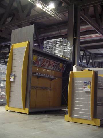 Sistem25, il sistema modulare per esporre articoli a self service, e di un’area (superiore) di stoccaggio pallet