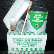La confezione di Vetroresin Sicuro è fornita in kit assieme alla resina trasparente per impregnazione, completa di pennello applicatore e bottiglia di solvente.