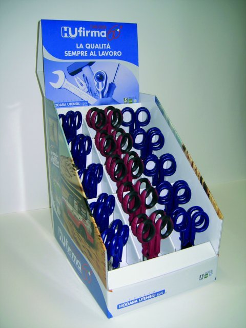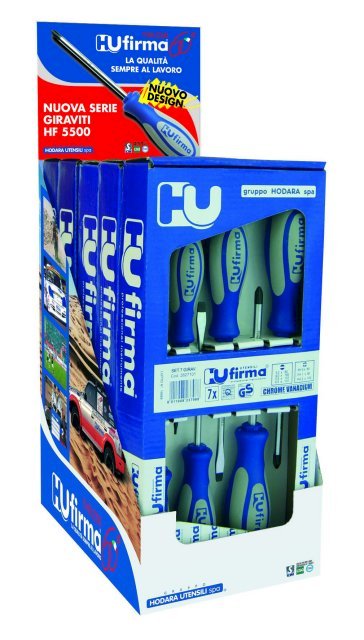 Per la storica azienda milanese, infatti, la fase di rinnovamento passa anche attraverso un nuovo modo di comunicare all’interno del punto vendita. Grazie a un forte coinvolgimento del marketing aziendale, il restyling dei prodotti a brand HuFirma (che ha interessato le nuove serie di set giraviti HF 5500, pinze HF 7500 e flessometro HF 821) ha implicato anche lo studio e la realizzazione di nuovi espositori da banco, che permettono una visibilità massima del prodotto unita a un piacevole impatto cromatico. Inoltre, per aiutare il rivenditore nella collocazione dei prodotti, l’espositore in cartone litografato plastificato lucido viene spedito già montato.