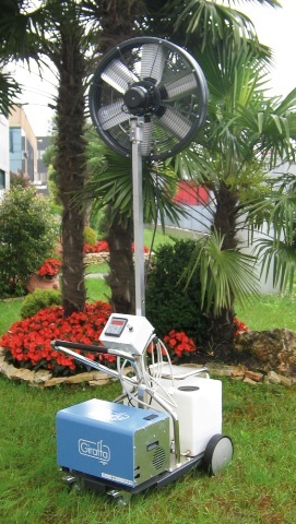 Giraffa di Idrobase è un potente ventilatore che spinge aria e acqua finemente ridotta in micro goccioline nell’ambiente circostante. Il ventilatore, montato su un telaio dotato di ruote, è brandeggiante e inclinabile sia in alto sia in basso. Giraffa si può spostare facilmente dove più se ne vuole ottenere beneficio e orientare il suo flusso d’aria e di nebbiolina dove si desidera.