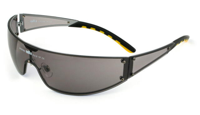 Anche il modello a mascherina 09107 è omologato EN 166. La monolente avvolgente e protettiva garantisce dai possibili danneggiamenti dell’occhio e non distorce la visione. La sfumatura grigia protegge l’occhio anche in ambienti esterni, mentre il terminale nero/giallo delle stanghette aderisce al capo in modo ergonomico.