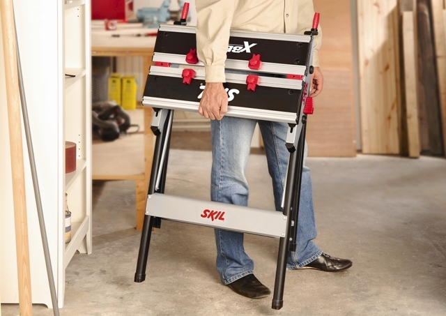 Facile da caricare e riporre - Per consentire di caricarlo, trasportarlo e riporlo agevolmente e senza sforzi, il modello 0950 utilizza il sistema pieghevole rapido Skil. Ciò consente di aprire e richiudere il banco di lavoro senza bisogno di utilizzare attrezzi. Al fine di fornire grande comodità sul posto di lavoro, il modello 0900 ha anche creato 2 scomparti nella parte bassa, così da poter accedere facilmente agli attrezzi manuali.