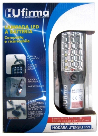 La nuova torcia Led HuFirma HF 14760, per utilizzi professionali e domestici, grazie all’assenza di cavi e al supporto magnetico integrato, permette di lavorare in ogni ambito e situazione. Inoltre la batteria allo ione di litio (Li-Ion) consente un’autonomia doppia rispetto alle classiche batterie NiMH e un’eccellente luminosità, eliminando anche l’effetto memoria. La torcia, a 18 led per una intensa illuminazione, si qualifica per una batteria di nuova generazione al litio Li-Ion 3,6 V e per un’intensità di illuminazione 580 Lux (0,6m). Resistente all’acqua e con rivestimento in gomma, HuFirma HF 14760, con dimensioni 210x60x40 mm, include un caricabatteria da 230 V e da 12 V per auto.