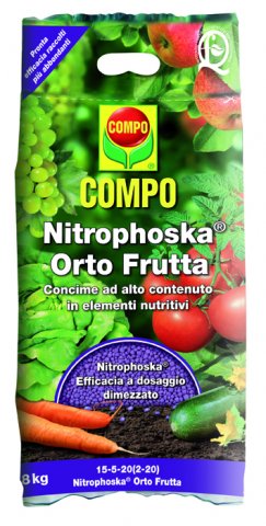 Nitrophoska Orto Frutta è il concime specifico per tutte le colture orticole e da frutto arricchito con elementi nutritivi (62%). Nutrimento minerale composto, ad alto titolo in azoto, potassio (solo da solfato), con un contenuto equilibrato di fosforo, magnesio e zolfo. Disponibile in sacchi da 4 e 8 kg.