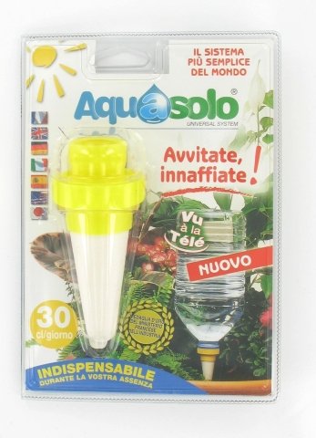 Aquasolo si costituisce di un cono diffusore in ceramica porosa che, applicato a una qualsiasi bottiglia di plastica, permette di rilasciare giornalmente una quantità precisa di acqua. Il cono è dotato di tre differenti ghiere di avvitamento che lo rendono universale e offre una soluzione di irrigazione per ogni singola pianta senza dover investire nell’acquisto di un apparecchio costoso. Aquasolo assicura una diffusione lenta e regolare nella terra fino a 70 giorni di irrigazione a seconda delle diverse esigenze.