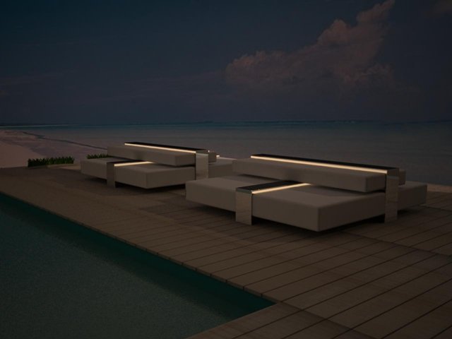 Maze, disegnata da Matteo Nunziati, è un progetto di sedute modulari,il cui elemento caratteristico sono le fasce di metallo che corrono tra la seduta e lo schienale: questi elementi fungono da piani di appoggio per gli oggetti e, grazie all’inserimento di luci a tecnologia led testate per gli spazi esterni, divengono fasce luminose destinate a connotare in modo elegante e sofisticato gli ambienti esterni.
