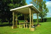 Interessante anche il modello di pergola, addossata o autoportante, prodotta con montanti in pino nordico da 7x7cm, banchine da 3,5x14xcm e arcarecci da 3,5x9cm uniti di testa da tavole di 2x9cm. La pergola viene fornita completa di grigliati rombo maglia 13cm e fioriera da 60cm. Infine segnaliamo il set relax, un pratico set composto da quattro sedie a sdraio e un tavolino quadrato, smontabili e facili da riporre, realizzati in tavole di pino nordico unite con colla e viti zincate.