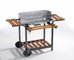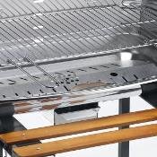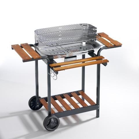 Nella foto il Barbecue in acciaio inox con carrello: ripiani e mensole laterali in legno massello; griglia di cottura in acciaio cromato regolabile in 4 posizioni; raccogli cenere e dispositivo brevettato d’accensione facilitata con cassetto estraibile in acciaio inox; paravento in acciaio inox con innesto di sicurezza e bordo antigraffio; robusto braciere in acciaio alluminato.