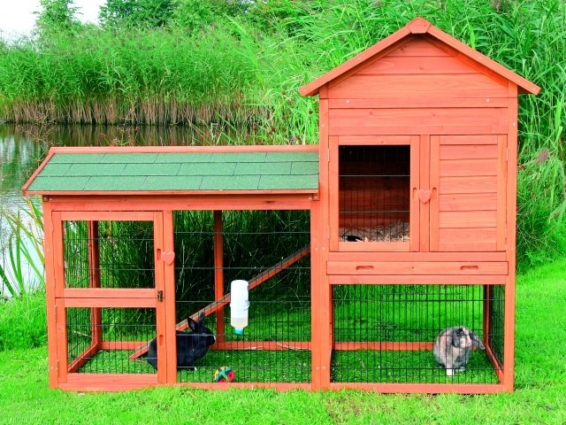 Realizzate in legno di pino verniciato sono a due piani, con casetta e con la possibilità di chiudere la botola interna. Entrambi i lati del tetto possono essere aperti separatamente e riempiti con paglia per un maggiore isolamento