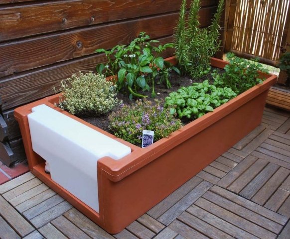 Per rispondere all’esigenza ormai diffusa di realizzare nella propria abitazione uno spazio dove coltivare frutta e verdura a km0, Verdemax propone L’orto in terrazzo, un contenitore di materiale plastico, con serbatoio da 6 lt, argilla espansa e un tappetino di Tnt, che una volta installato, riempito di terriccio e messo a dimora le piantine, consente all’utilizzatore di coltivare non solo erbe aromatiche ma anche ortaggi.