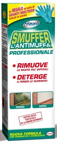 Con Ariasana Smuffer di Henkel Italia si sfrutta l’efficacia di un prodotto antimuffa professionale. La muffa, ma anche le alghe e i muschi, che si annidano in ambienti interni ed esterni, si possono eliminare grazie alla forza dei tensioattivi contenuti e sulla cui efficacia sono stati effettuati numerosi test di laboratorio. Si tratta di un prodotto viscoso che non solo rimuove ma deterge in modo profondo le superfici. È adatto quindi per muri, interstizi e per le giunture annerite tra le piastrelle. Se usato diluito è indicato per pulire pavimenti, docce, piscine e sanitari.