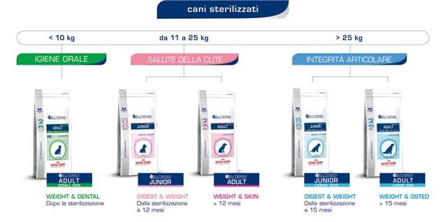 Royal Canin propone l’innovativa linea Neutered Dog. Le nuove 5 diete della linea sono pensate per fronteggiare il rischio di aumento di peso nei cani, a seguito dalla sterilizzazione.