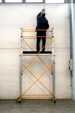 Costruito secondo le normative italiane, la genialità di quest’attrezzatura non va a scapito della sicurezza. I pioli sono zigrinati e antisdrucciolo, per una solida presa di mani e piedi; vengono fissati ai montanti tramite ribordatura e un gancio di sicurezza impedisce lo sfilo accidentale dell’ultimo tronco. Il piano di calpestio è in alluminio e legno multistrato verniciato contro le intemperie; un gancio anti-vento assicura ogni piano al resto della struttura per evitarne movimenti accidentali. Le cerniere di scorrimento e tenuta sono in estruso di alluminio; un perno di sicurezza impedisce l’elevazione del trabattello e della scala oltre l’altezza consentita. Il sistema di aggancio traverse è costituito da manopole in nylon che fissano le traverse alla struttura per una rigidità perfetta.