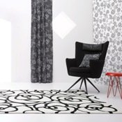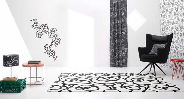 Per finire in bellezza è disponibile una linea completa di tessili in coordinato: il cuscino, la tenda e la lampada da tavolo Garland, tutti decorati con il motivo della rosa in bianco e nero.