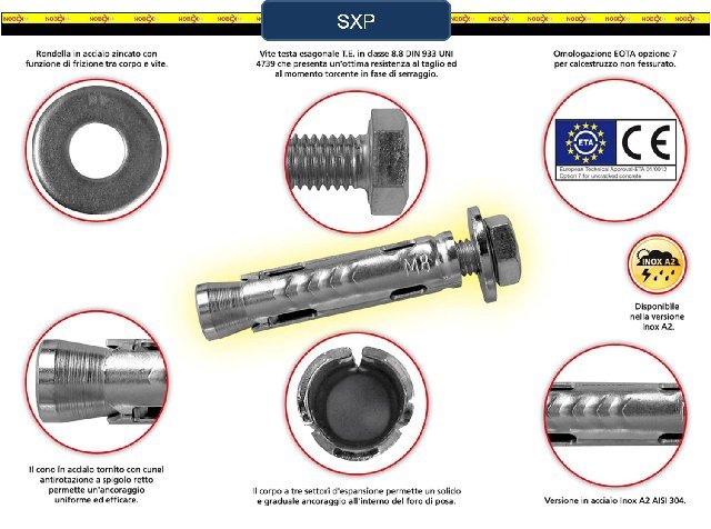 Nella gamma proposta da Nobex, il tassello SXP in acciaio omologato Eota con opzione 7 viene utilizzato in edilizia come tassello per fissaggi medio pesanti nel settore elettrico e nella carpenteria metallica.