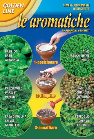 Si tratta di dischetti preseminati del diametro di circa 10 cm. Nella busta sono contenuti sei dischetti, ognuno dei quali è pronto per essere posizionato nel vaso e corrisponde a una singola specie di aromatica come descritto in busta.
