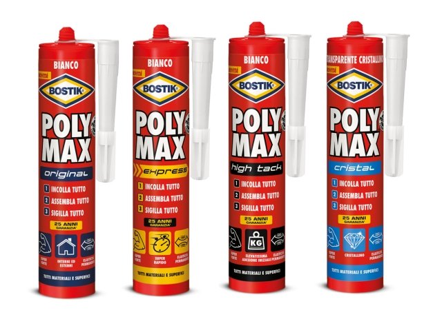 Partendo da un'attenta analisi delle richieste del consumatore, Bostik ha sviluppato una gamma completa di prodotti che si adeguano perfettamente alle sue esigenze. Le caratteristiche maggiormente richieste dall'utilizzatore negli adesivi di montaggio (utilizzo in ambienti interni ed esterni, forza, rapidità e trasparenza) le ritroviamo nei quattro prodotti della gamma Poly Max. Al tempo stesso adesivo professionale e sigillante, Poly Max è la soluzione totale per ogni esigenza di incollaggio e sigillatura, ideale per tutti i materiali, tutte le superfici e tutte le condizioni. Lo speciale polimero di eccellente qualità conferisce resistenza finale molto elevata