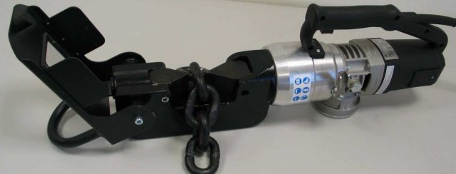Nella foto, la cesoia taglia catene TC32. Queste le caratteristiche tecniche: diametro di taglio 32mm, grado 60, Tensione 230V/50Hz, Watt 1100, potenza idraulica fino a 31ton, dimensioni 605mm X 250mm X 160mm, peso 37,5kg, pressione 700bar.