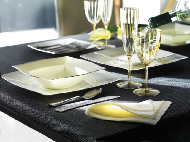 Di segno opporto la linea Ivory di Modus Vivendi, che propone piatti e bicchieri in plastica che ricordano i servizi di ceramica più eleganti. La forma originale, il colore avorio e l’elegante filo color oro che contraddistinguono la linea di piatti, così come l’effetto glittering che caratterizza i bicchieri fanno di Ivory un coordinato raffinato, adatto per le occasioni importanti in cui si vuole eleganza senza rinunciare alla praticità.