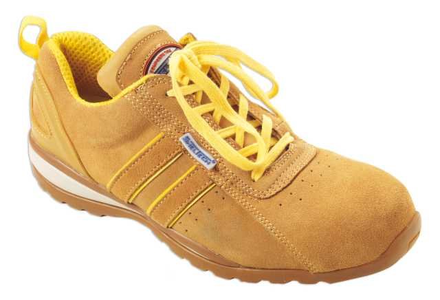 Hamilton: calzatura bassa in pelle scamosciata colore cammello con piccoli fori, fodera interna di colore giallo, linguetta imbottita, puntale in composito, lamina non metallica, soletta estraibile traspirante e antistatica, suola in gomma EVA, antiscivolo e antistatica.