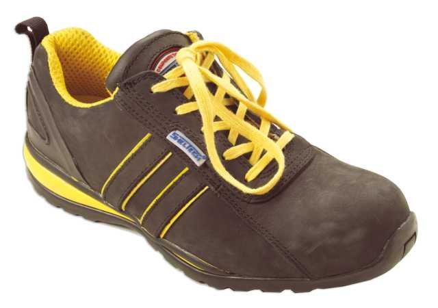 Yuma: calzatura bassa in nabuk colore nero con inserti gialli, fodera interna di colore giallo, linguetta imbottita, puntale in composito, lamina non metallica, soletta estraibile traspirante e antistatica, suola in gomma EVA, antiscivolo e antistatica.