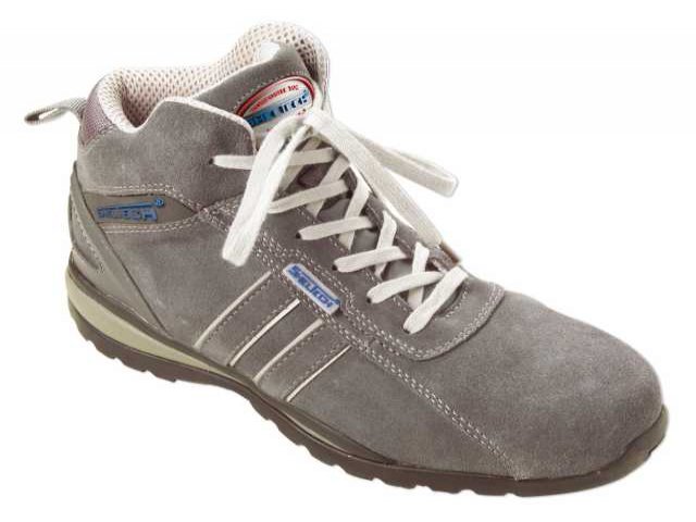 Toronto: calzatura alta in pelle scamosciata colore grigio, fodera interna di colore grigio, linguetta imbottita, puntale in composito, lamina non metallica, soletta estraibile traspirante e antistatica, suola in gomma EVA, antiscivolo e antistatica.