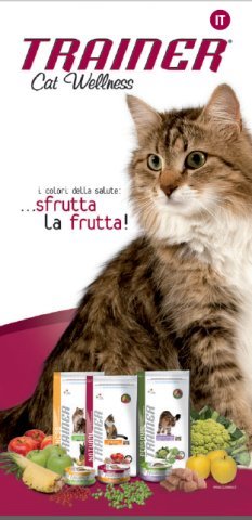 Per mantenere in forma il gatto, Trainer di Novafoods utilizza ingredienti funzionali di origine vegetale con importanti proprietà salutistiche, che conferiscono alla frutta e ai vegetali il loro caratteristico colore: rosso, giallo e verde. La linea è suddivisa in tre grandi famiglie contraddistinte dal colore del nutraceutico ad azione prevalente. Trainer Natural: alimenti fisiologici con ingredienti funzionali di colore rosso ricchi di antiossidanti, in grado di preservare la funzionalità renale (mirtillo) del gatto. Trainer Fitness: alimenti monoproteici con ingredienti funzionali di colore giallo ricchi di antiossidanti, in grado di contrastare le manifestazioni allergiche. Trainer Personal: alimenti speciali con ingredienti funzionali di colore verde ricchi di antiossidanti realizzati per soddisfare i fabbisogni unici dei gatti con esigenze particolari e specifiche formulazioni in grado di: esaltare la bellezza del mantello e la forma fisica; risolvere il problema della sensibilità intestinale; ridurre il problema del sovrappeso; favorire la rimozione e l’espulsione del pelo ingerito; preservare la funzionalità renale.