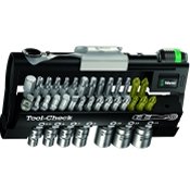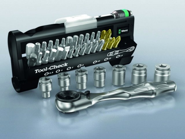 È la nuova proposta di utensili Wera: 38 pezzi racchiusi in una cassetta portautensili in materiale plastico dalle ridotte dimensioni. Raccolti in maniera ordinata e sicura, gli utensili che compongono Tool Check si rivelano indispensabili per una molteplicità di avvitamenti. La valigetta, infatti, contiene un cacciavite a cricchetto per inserti, un portainserti “Rapidaptor”, nonché 28 inserti, 7 bussole esagonali e un adattatore per bussole. Con il giravite a cricchetto per inserti si possono azionare inserti e bussole; il portainserti Rapidaptor funge da prolunga e può essere usato anche con inserti lunghi secondo E 6,3 (ISO 1173). Nonostante la vasta gamma di utensili offerti, il Tool-Check Wera - distribuito da Dami - misura solo 15 x 8 cm.