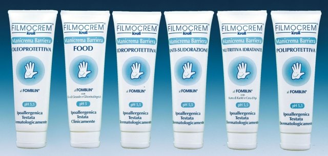 La più professionale ed efficace è la linea Manicrema Barriera FILMOCREM, una linea completa di prodotti a pH 5,5 dermatologicamente testati ed a base di Fomblin HC, un polimero liquido (perfluoropolyethers) brevettato da Solvay Solexys S.p.a. La caratteristica di questa molecola è quella di proteggere la pelle dal contatto con gli agenti chimici irritanti e, nel contempo, di lasciare traspirare la cute, mantenendone inalterate le funzioni fisiologiche. La linea Filmocrem comprende le seguenti specialità: