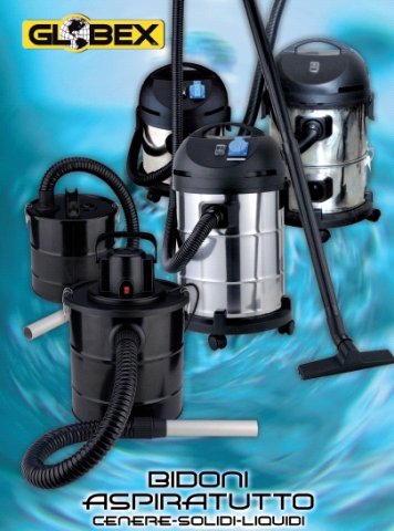 Bidone Aspira Solidi-Liquidi (20 e 30 lt. - 1200 Watt), con fusto interamente in acciaio inox, è dotato di presa per elettroutensili montata sulla scocca per un utilizzo combinato con trapani, martelli pneumatici ecc; Bidone Aspira Solidi-Liquidi-Cenere (15+15 lt. - 1200 Watt), con fusto interamente in acciaio inox, ha un doppio serbatoio che consente l’aspirazione anche di ceneri da stufe, caminetti e barbecue; Aspiracenere Elettrico “Tornado” (18 lt. - 1200 Watt), ha il fusto interamente in acciaio verniciato con tubo flessibile in alluminio rivestito in plastica; è un ottimo strumento per rimuovere la cenere da stufe, caminetti e barbecue.