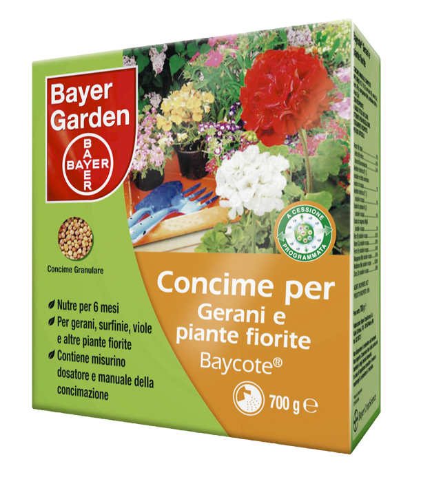 Per nutrire al meglio i gerani occorre dar loro gli elementi essenziali per uno sviluppo ottimale. Baycote Gerani e Piante Fiorite è un concime minerale in formulazione granulare con azoto, fosforo e potassio. Grazie alla tecnologia della “cessione programmata” i granuli di concime rilasciano gradatamente gli elementi essenziali per la pianta, nutrendola per circa 6 mesi.