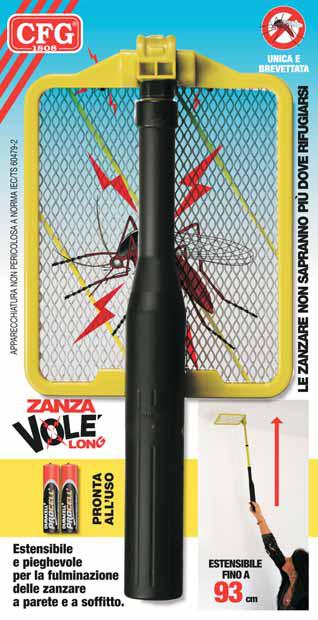 Con Zanza Volè Long, CFG fa punto, set e partita e mette fuori combattimento ogni tipo di insetto volante. Zanza Volè Long è infatti una racchetta estensibile (fino a 93 cm) e pieghevole per la fulminazione di zanzare e insetti sia che si trovino sulla parete sia sul soffitto, ed è composta da due reti metalliche e un circuito elettronico in grado di produrre scariche elettriche di alta tensione ma bassa intensità di corrente. Al contatto con le maglie metalliche sotto tensione, l'insetto viene fulminato per la differenza di potenziale tra le due reti.