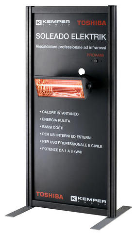Se Toshiba fornisce la propria tecnologia, Kemper Group mette in campo la propria esperienza commerciale e di marketing. L’azienda parmense, infatti, ha sviluppato un supporto espositivo per il punto vendita che, enfatizzando la collaborazione con Toshiba, mira a incentivare il sell-out del rivenditore. Il pannello, che monta una lampada Soleado Elektrik, è dato in uso gratuito al cliente e illustra tutte le caratteristiche tecniche del prodotto. Ma la migliore spiegazione, come sempre, è la prova sul campo: basta inserire la spina e la lampada irradia immediatamente calore.