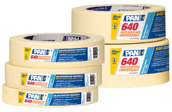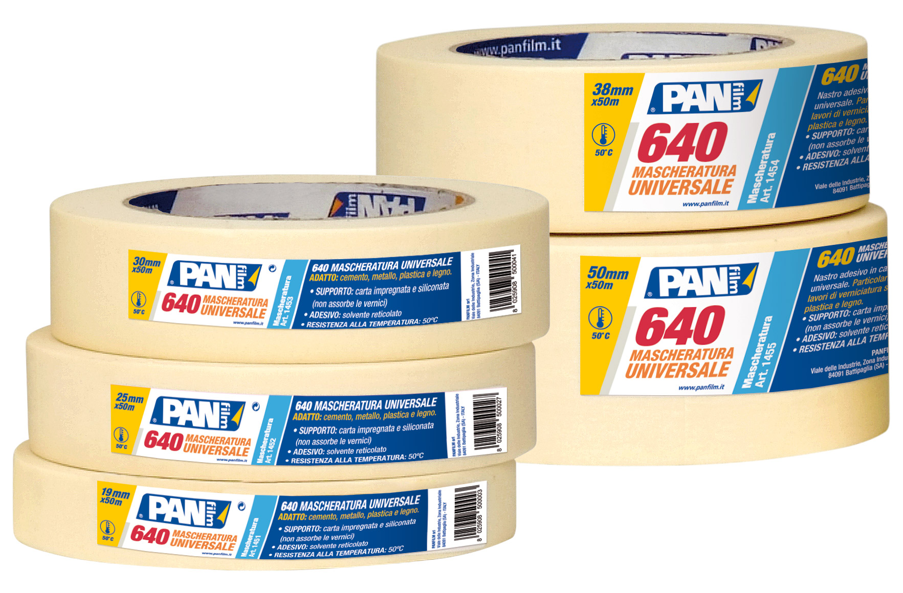 In foto, il nastro Pan Paint 640 specifico per mascheratura edile. È un nastro adesivo in carta per mascherature a temperatura ambiente, adatto per lavori di verniciatura sulla maggior parte delle superfici (cemento, metallo, plastica o legno). La carta impregnata e siliconata non assorbe le vernici, l'adesivo solvente reticolato garantisce una buona tenuta e una resistenza fino a 50°C di temperatura.