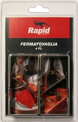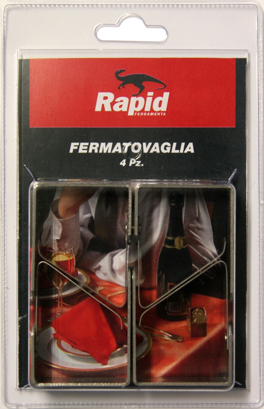 La confezione, ora in blister self service, è termosaldata con materiali ad alta resistenza e contiene 4 pezzi del fermatovaglia, disponibile in tutte le misure e colori della gamma Rapid. Completa di codici a barre e descrizioni, viene consegnata in mini box da 25 blister.