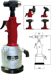 RIV536 è progettata per la posa di rivetti a strappo standard in tutte le leghe fino al diametro 4,8 ed è equipaggiata con quattro ugelli specifici per i diametri 2,4 – 3,2/3,4 – 4,0 – 4,8.