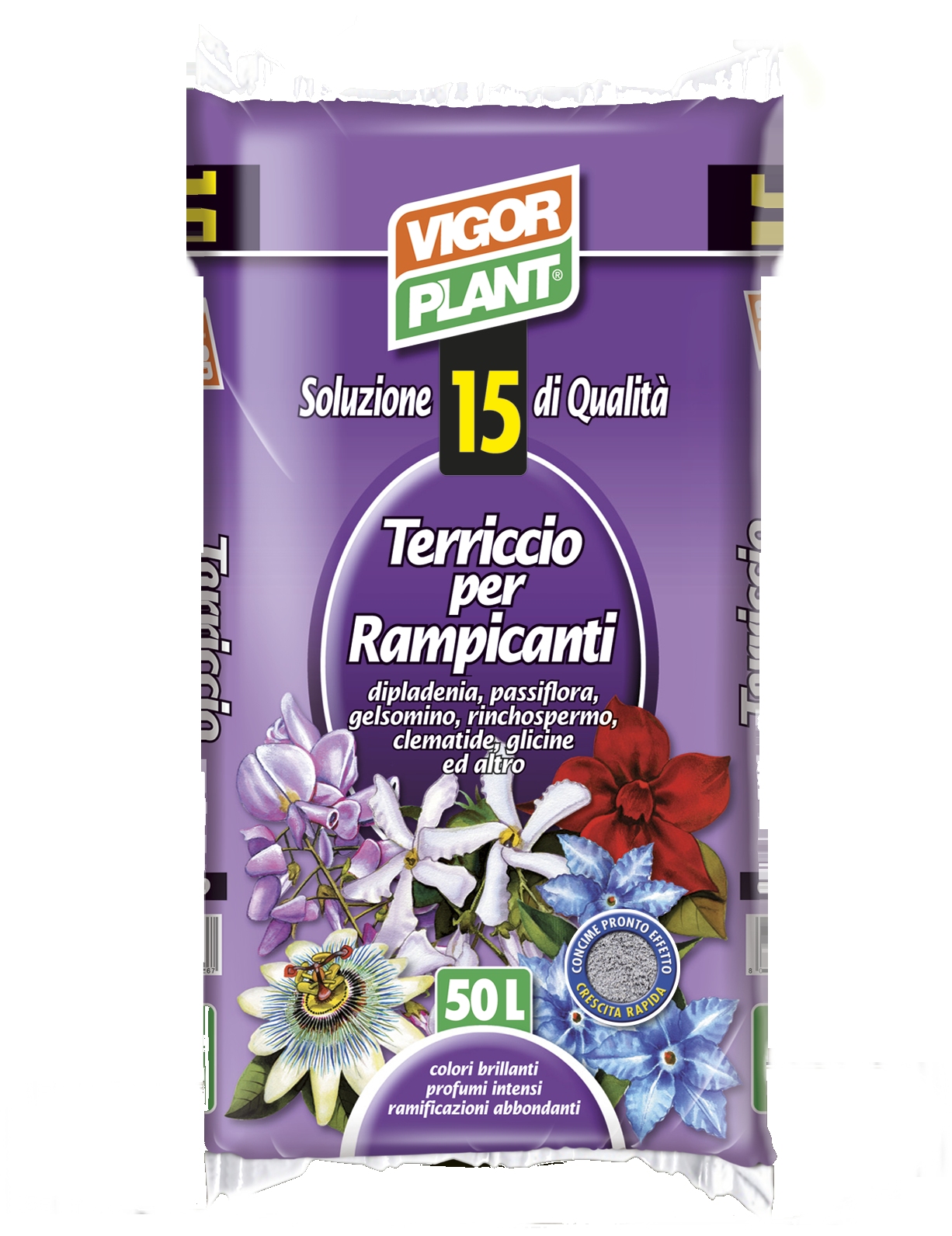 La Linea Soluzioni di Qualità Vigorplant, composta da terricci specifici per soddisfare ogni singola specie vegetale, si arricchisce di un nuovo prodotto, il terriccio per Piante Rampicanti S.Q. 15, specificatamente formulato per la coltivazione in vasi o fioriere di arbusti fioriti rampicanti sia sempreverdi sia a foglia caduca, quali Actinidia Kolomikta, Bignonia, Clematis, Hedera, Hydrangea Petiolaris (ortensia rampicante), Gelsomino, Rincospermo, Lonicera, Partenocissus (vite del Canada), Passiflora, Wisteria (glicine), Dipladenia, etc. Le piante rampicanti infatti necessitano di un terreno ricco di sostanze organiche che dia loro il giusto sostentamento per la crescita e di materiali che permettano un ottimo drenaggio. Il nuovo terriccio Vigorplant, che è stato studiato per rispondere proprio a queste esigenze, è caratterizzato da un’importante presenza di minerali naturali, fondamentali per garantire uno sgrondo immediato delle acque in eccesso, sia piovane sia di irrigazione, prevenendo i ristagni idrici. Anche la struttura del terriccio è studiata per assicurare una maggiore quantità di ossigeno alle radici. Gli elementi nutritivi contenuti in questo terriccio sono necessari per una rapida affrancatura della pianta, poi si dovrà ricorrere alle consuete concimazioni di copertura.