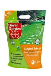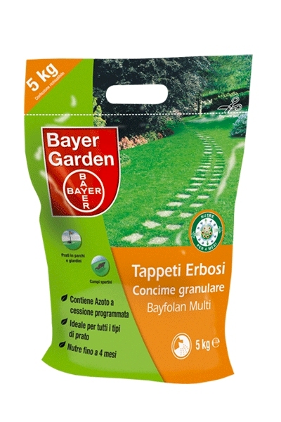 La cura del manto erboso richiede spesso l’aiuto di un concime specifico specialmente negli impianti nuovi e di grandi dimensioni; Bayer garden propone Bayfolan multi tappeti erbosi, un concime minerale granulare adatto a questo tipo di esigenze. Questo concime, grazie alla speciale formulazione granulare a basso titolo di cloro e contenente potassio e azoto a cessione programmata, nutre il prato in maniera equilibrata per circa 4 mesi, rendendolo anche più resistente al calpestio. Una colorazione più intensa è garantita dalla qualità degli elementi nutritivi che rendono Bayfolan multi tappeti erbosi un concime ideale anche per tappeti erbosi di parchi o ampi giardini. Il prodotto è disponibile in sacchetti che stanno in piedi da 5 kg, provvisti di manico per un agevole trasporto e di zip per la chiusura.
