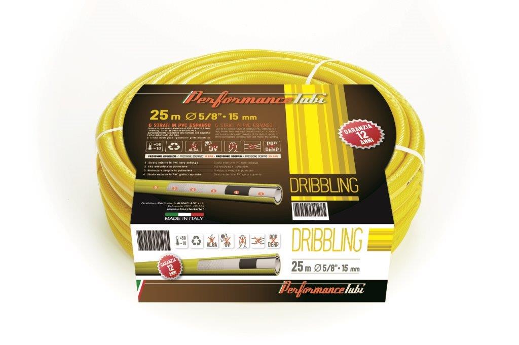 È considerato il fiore all’occhiello nell’assortimento della gamma “Performance Tubi” di ALMAPlaste si chiama Dribbling. È un tubo da irrigazione composto da sei strati, due dei quali sono rinforzi combinati di rete, così da garantire la massima resistenza alla pressione e alla torsione, e di maglia, per dare al tubo una buona elasticità. Leggerezza e flessibilità sono invece date da uno strato interno che è in pvc espanso. Poiché ALMAPlast è attenta all’ambiente, una caratteristica importante è che tutti i materiali di cui è composto Dribbling sono a norma Reach, per il totale rispetto della natura e della salute. In Dribbling robustezza e maneggevolezza si coniugano per essere il tubo per ogni utilizzo.