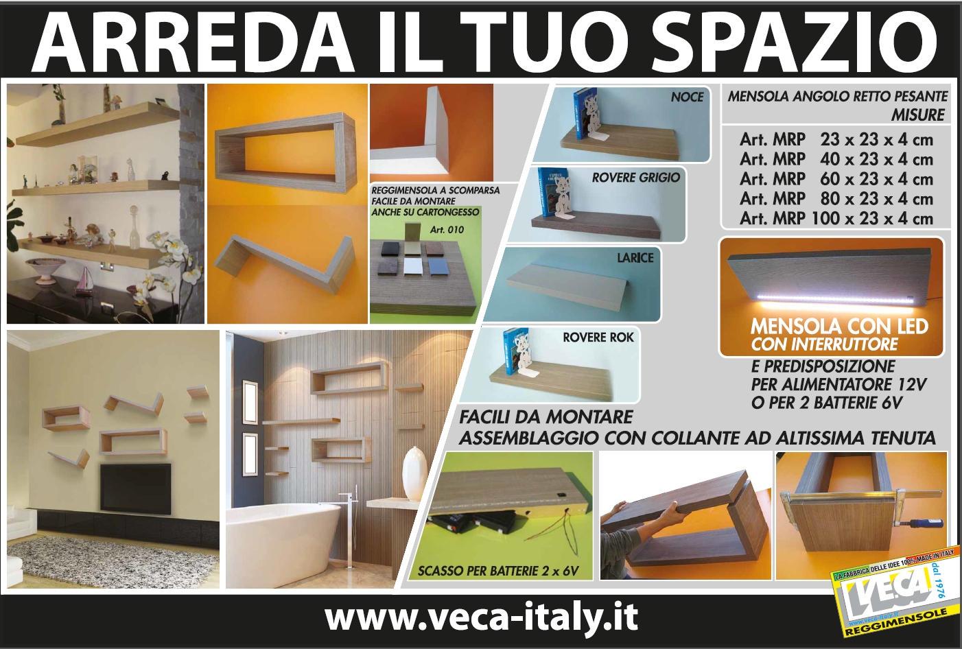 Le mensole proposte da Ve.Ca. permettono di creare infinite composizioni e si possono fissare anche al cartongesso, grazie al reggimensola a scomparsa progettato dalla stessa azienda. La particolarità è l’inserimento del Led a 12 V (non sono quindi necessarie particolari normative), che si può alimentare tramite un piccolissimo trasformatore a corrente 220 V, oppure tramite un paio di batterie da 6 V. All'interno della mensola è stato creato uno scasso per alloggiare le batterie che hanno il grande vantaggio di un consumo estremamente basso. Adatta a qualsiasi ambiente, la mensola con Led si rivela molto utile se posizionata sopra a una scrivania, per illuminare l'ambiente di studio e di lavoro.