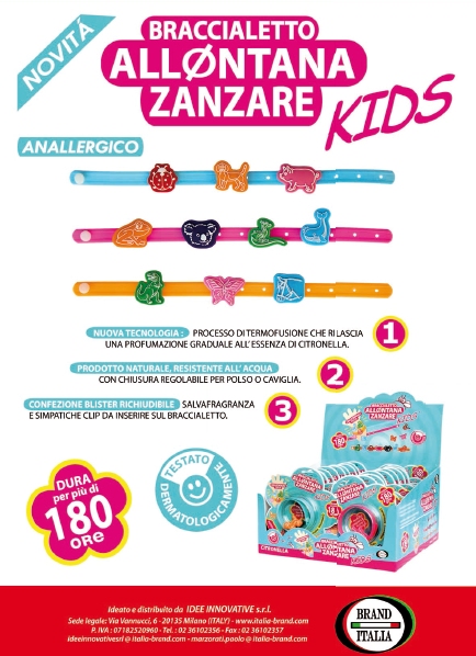 Da Idee Innovative una proposta per la prossima estate per tenere ben lontane le fastidiose zanzare. È il braccialetto allontana zanzare kids anallergico, testato dermatologicamente, pensato per i piccoli. Realizzato con una nuova tecnologia, cioè un processo di termofusione che rilascia una profumazione graduale all’essenza di citronella, è un braccialetto resistente all’acqua e con chiusura regolabile per ogni polso o caviglia. La nuova formula è potenziata con olio di Neem, efficace anche contro le zanzare tigre. La confezione in blister richiudibile è salvafragranza e contiene delle simpatiche clip da applicare al braccialetto. La durata è di oltre 180 ore. Ogni espositore contiene 20 confezioni.