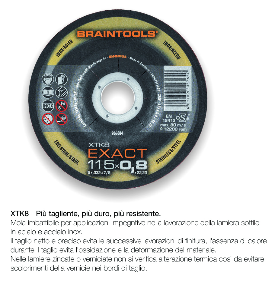 - Mola a spessore sottile XT8 per taglio acciaio e inox con spessore 0,8 mm, una delle primissime, con queste caratteristiche, ad aver fatto la sua comparsa sul mercato degli abrasivi.