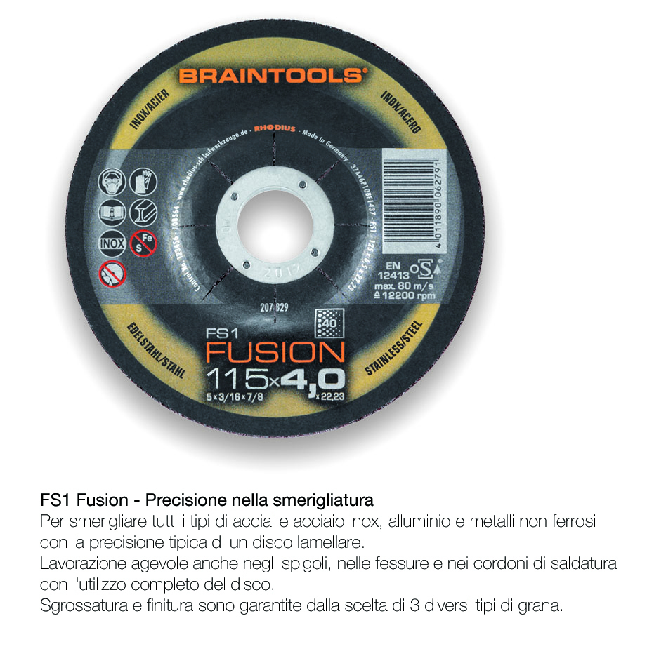 - Mola abrasiva FS1 FUSION che permette una smerigliatura e finitura perfetta nei cordoni di saldatura e negli angoli.