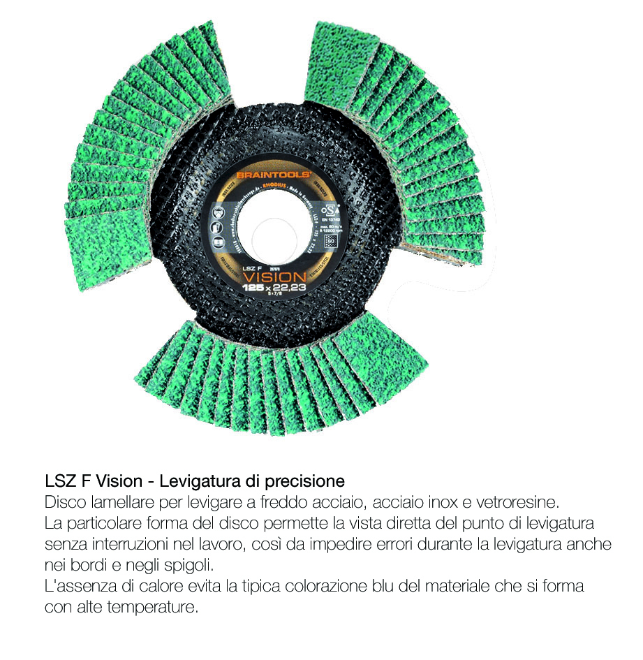 - Disco lamellare LSZ F VISION, unico nel suo genere con una struttura a tre settori che consente di vedere attraverso il disco il grado di asportazione di materiale e la finitura del pezzo in lavorazione.