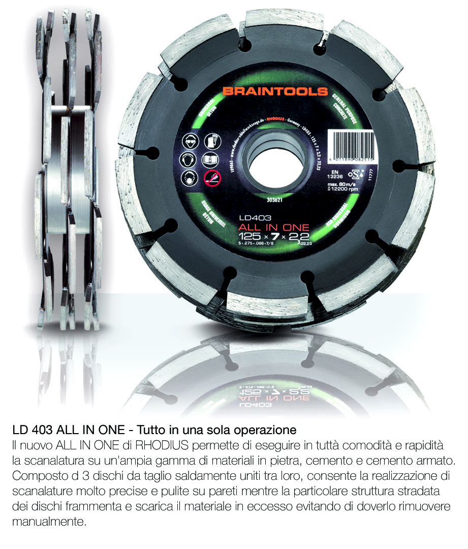 Recentemente Rhodius ha introdotto il nuovo LD403 ALL IN ONE, un disco diamantato composto da tre singoli dischi per la scanalatura delle pareti, molto richiesto nel settore edile in quanto consente di effettuare la scanalatura della parete rimuovendo contemporaneamente anche il materiale murario all’interno della stessa. In un unico passaggio quindi la scanalatura è pronta e pulita con relativo risparmio di tempo e riduzione dei costi. Questo disco è stato vincitore della EISEN 2012 INNOVATION AWARD. Il nuovo catalogo Rhodius è stato inoltre arricchito di numerosi nuovi articoli, a completamento di una già generosa gamma di abrasivi che testimonia una vitalità e un impegno costante dell’azienda nel fornire strumenti per gli impieghi più svariati. La crescita continua in termini di produzione e di fatturato ha indotto lo scorso anno Rhodius a investire nell’ampliamento della superficie produttiva e nella ricerca con la realizzazione anche di una modernissima area tecnica che consente di effettuare tutti i test necessari per la formazione anche tecnica dei propri venditori. Per Reit, che distribuisce in tutto il territorio nazionale utensili di qualità, la partnership con Rhodius rappresenta uno dei punti di forza dell’azienda veneta. La difficile situazione congiunturale del mercato italiano non ha impedito il proseguimento del trend di crescita di Rhodius in Italia, segno che l’esigenza di sempre più elevati standard qualitativi da parte degli utilizzatori è di gran lunga predominante rispetto alla sola ricerca del miglior prezzo.