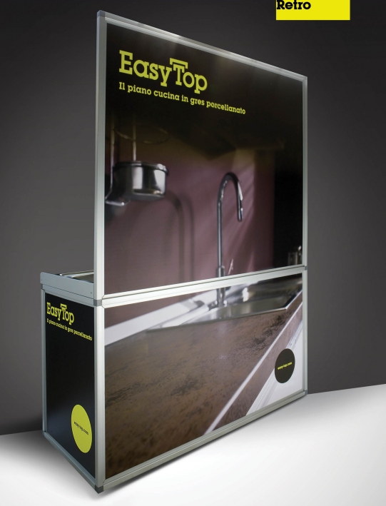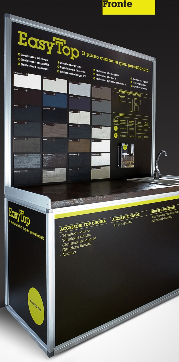 Dallo studio di nuove metodologie produttive nascono i Top in gres porcellanato destinati al mercato brico. Nuovi materiali e funzionalità, semplicità d'uso e un rapporto qualità/prezzo sorprendente rendono questi prodotti un'interessante novità di mercato. La ceramica è uno dei prodotti più longevi disponibili sul mercato ed è utilizzato principalmente per pavimenti e rivestimenti. Oggi EasyTop rende possibile l’impiego innovativo della ceramica per la realizzazione di top cucina o tavoli, offrendo il prodotto a un prezzo accessibile. La lastra in ceramica dallo spessore di 3,5 mm viene applicata su un pannello sandwich leggero in legno, tramite apposite resine. La medesima applicazione viene utilizzata per la realizzazione del bordo. Dopo anni di ricerche e test, nasce un piano in ceramica altamente tecnologico, leggero e resistente. EasyTop è il progresso del piano cucina tradizionale realizzato con materiali come l’agglomerato di quarzo, il laminato, il granito o il marmo naturale. I nuovi piani cucina sono Easy, per il loro costo contenuto (fino a 6 volte inferiore rispetto a un piano cucina tradizionale) e la facilità di applicazione da parte degli appassionati di bricolage, e Top per la qualità del gres porcellanato, sia livello estetico che pratico, grazie alle sue caratteristiche di resistenza ai graffi, alle macchie e al fuoco. L'ampiezza della gamma, proposta in 28 differenti colorazioni, permette al consumatore di trovare il prodotto che meglio si adatta al suo contesto abitativo. La gamma si completa con i tavoli, sempre in gres porcellanato, che sfruttano la stessa tecnologia e ampiezza di gamma. Si va dai classici white e differenti tonalità del legno fino a colorazioni più specifiche per uno stile di arredamento moderno, come il blu e il viola. Naturalmente il piano viene venduto insieme alle gambe in alluminio e il kit per il facile assemblaggio del prodotto.